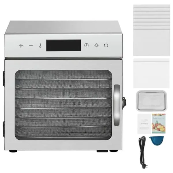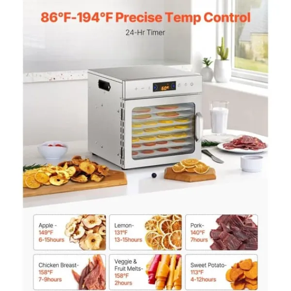 - **Stor kapacitet:** Med möjlighet att torka upp till åtta lager mat samtidigt kan du hantera stora mängder ingredienser på en gång. Den smarta digitala displayen och 24-timmars timern ger enkel kontroll och övervakning utan krav på konstant tillsyn.
