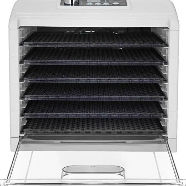 Frukt- och grönsaksdehydrator – effekt 500 W, för att torka kött, svampar, örter, te, nötter, frön, pasta, kakor, pannkakor, 6 hyllor, diameter på hyllorna 33 cm, digital kontroll, automatisk avstängning, med timer, justerbar temperatur från 35 till 75 °C, förinställda program, med överhettningsskydd, skärm, Air Flow-teknologi, horisontell luftström, hyllor i plast, material på dehydratorn i plast, mått 31 × 34,5 × 45 cm (H × B × D)