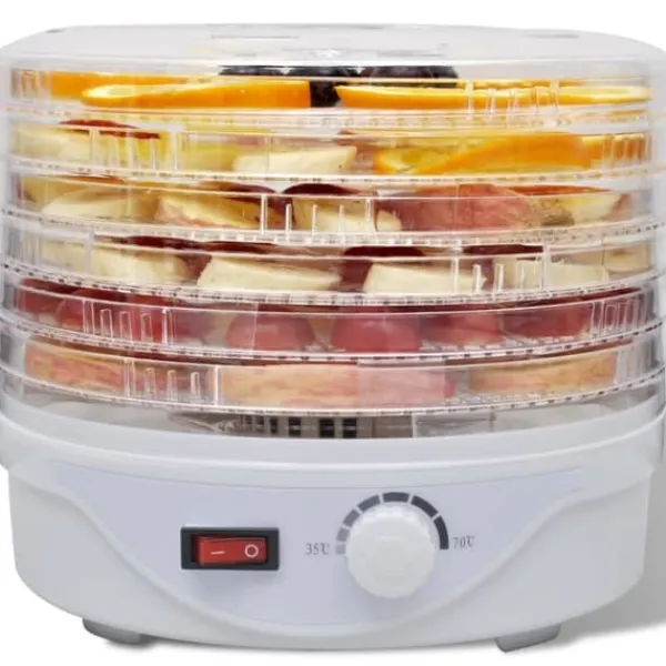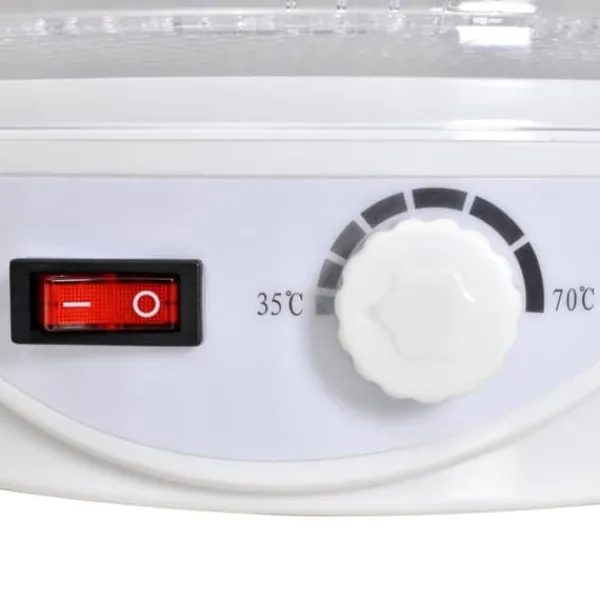 Mattorken har en genomskinlig överdel för att övervaka torkningen. Dessutom minskar torkningstiden drastiskt; du kommer att få läckra torkade livsmedel inom några timmar, inte dagar! I motsats till den traditionella torkningstekniken med roterande brickor använder denna en fläkt som tvingar radiellt luftflöde, vilket hjälper all mat på varje bricka att torkas jämnt utan att blanda smakerna. Mattorkaren är också utrustad med ett justerbart system med temperaturkontroll för att möta kraven hos olika livsmedel. Den effektiva frukttorken är enkel att använda: du bara rengör den, lägger maten på brickorna, ställer in en lämplig temperatur och startar därefter maskinen. Inom några timmar är din mat torkad och redo att äta eller förvara.