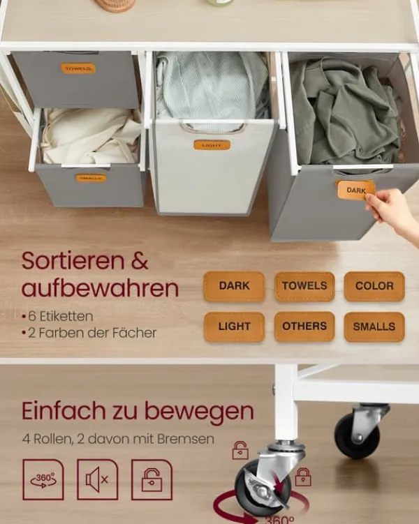 Denna tvättsorterare har fyra fack och praktiska hjul, vilket gör tvättorganisering och transport enkel. Den inkluderar även en överskiva för extra förvaring och små sidofickor för extra saker.