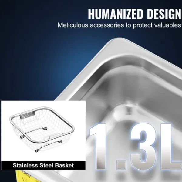 PREMIUM SUS304 MATERIAL – Tankstorlek: 1-1,3 L; Ultraljudseffekt: 60 W. Denna ultraljudsrengörare är tillverkad av robust 304 rostfritt stål, vilket garanterar att inget vatten läcker ut och säkerställer en lång livslängd. Dessutom finns en extra korg för att minska kollisioner mellan vassa föremål och tanken.