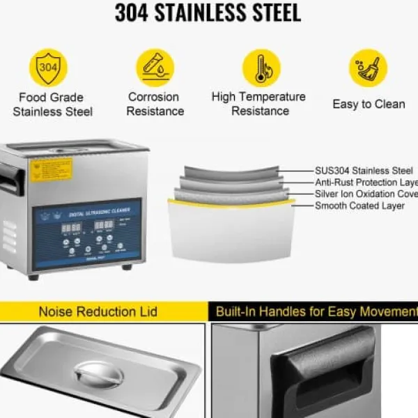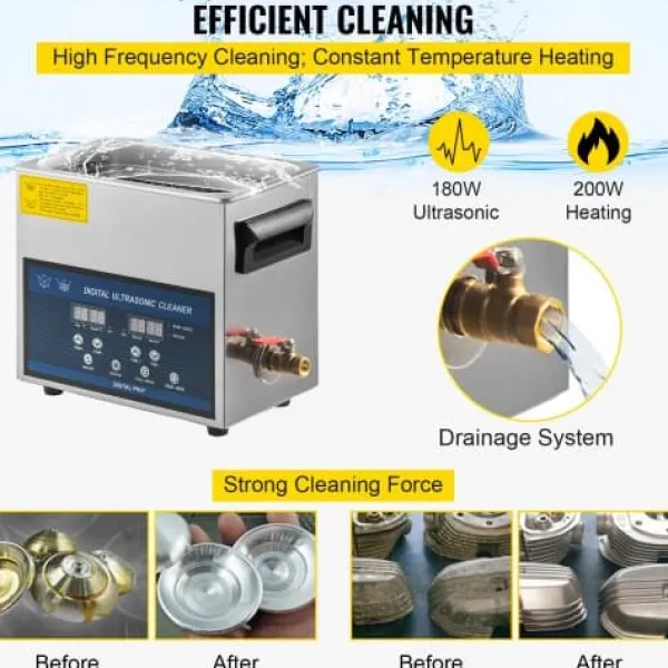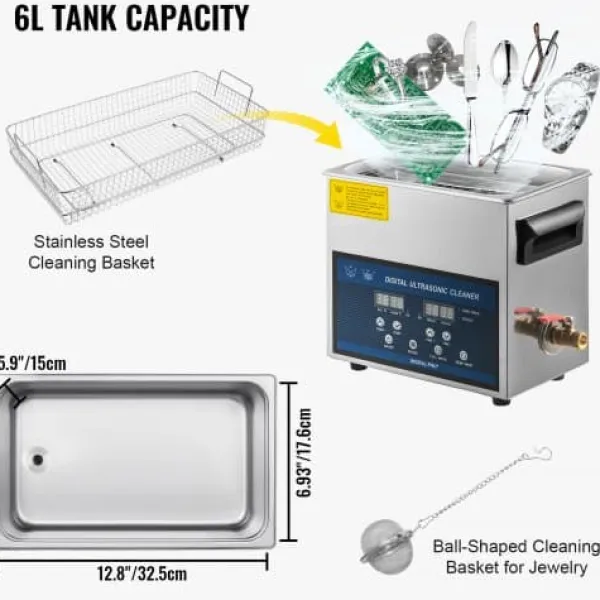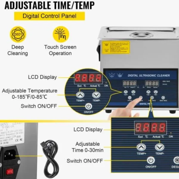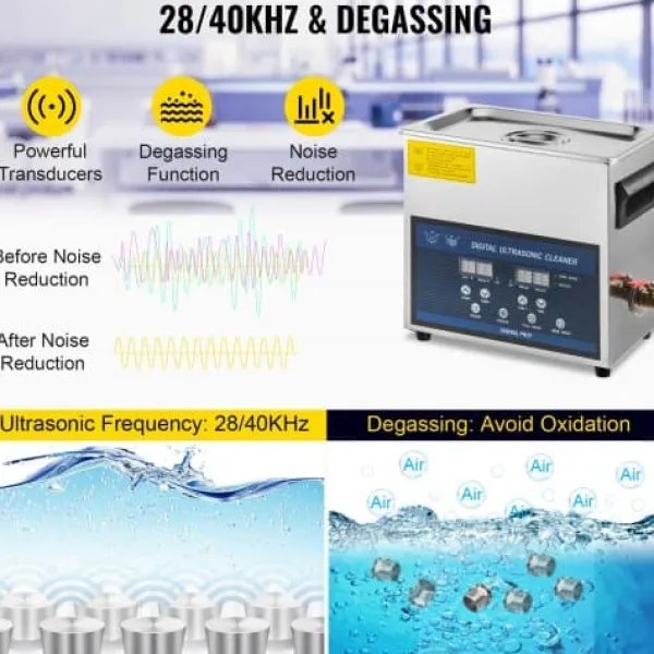Denna ultraljudstvätt erbjuder effektiv och grundlig rengöring för smycken, glasögon, tandproteser, kretskort och andra ömtåliga föremål. Med dubbelfrekvent ultraljudsteknik och justerbar uppvärmning garanteras optimala resultat för olika rengöringsbehov. Den användarvänliga designen inkluderar en praktisk LED-display och funktioner för enkel användning.
