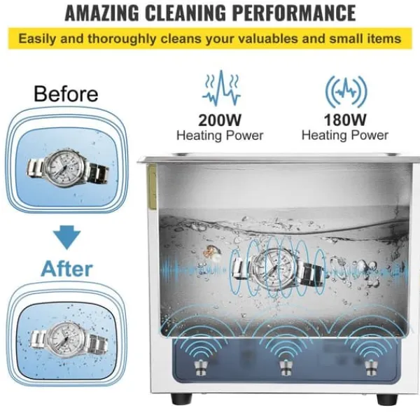 Skonsam djup rengöring: Vår ultraljudsrenare erbjuder en justerbar frekvens mellan 36-40 KHz för professionell rengöring. För ytrengöring rekommenderas 36 KHz, medan 40 KHz är idealiskt för att effektivt ta bort envisa rester inuti föremål. Med tre ultraljudsgivare förstärks ultraljudseffekten. Med en ultraljudseffekt på 180 W och en värmeeffekt på 200 W uppnås enastående rengöringsresultat.