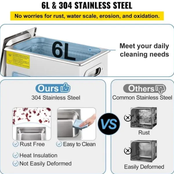 6 liters tank i rostfritt stål: Vår ultraljudsrenare har en 6 liters (1,59 Gal) tank i rostfritt stål och en rengöringskorg. Materialet SUS 304 förhindrar rost och korrosion, vilket ger en längre livslängd än andra modeller med SUS 201.