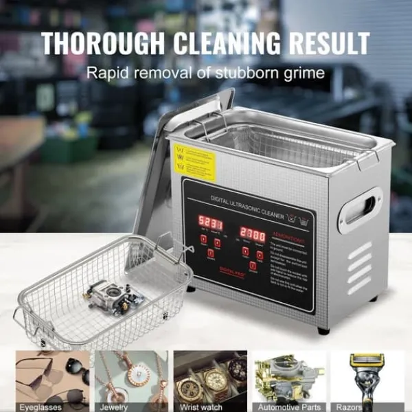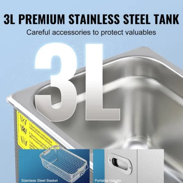 Generös 3-liters tank: Denna ultraljudsdelarengörare har en rymlig 3-liters tank och en praktisk rengöringskorg som minimerar friktionen under rengöringscykeln. Den integrerade rengöringskorgen är perfekt för att säkra dina smycken, glasögon, kretskort, rakhyvlar, förgasare och klockor på plats.