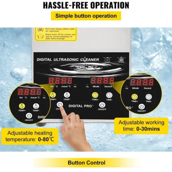 Utrustad med tid & temperaturinställare. Timerinställning med 0-30 minuter justerbar. Temperatur med 0-80 ℃ justerbar, vilket förbättrar effektiviteten av ultraljudsrengöring av envisa fläckar. Ultraljudsrengörare, smyckesrengöring, ultraljudsrengöringsmedel.