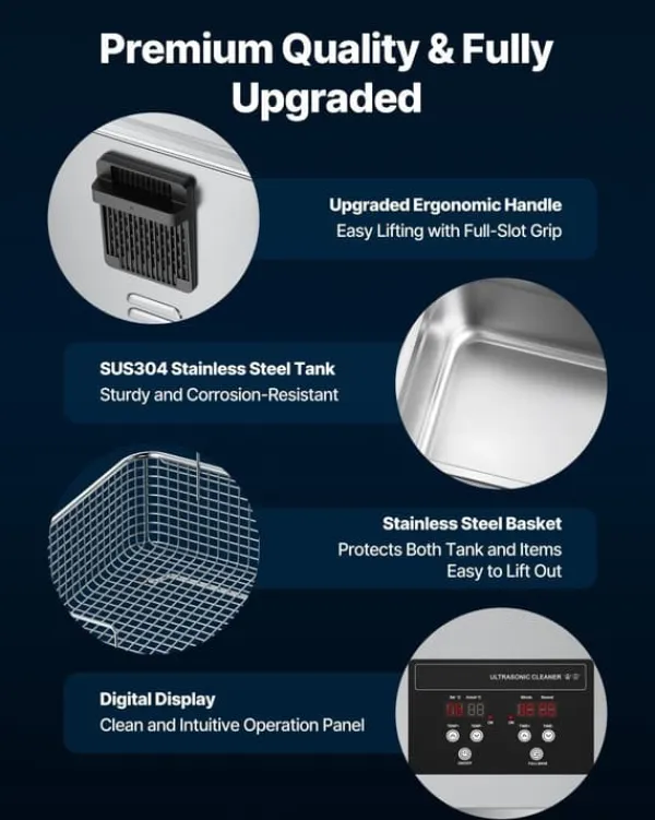 Innertank och korg i korrosionsbeständigt rostfritt stål ger lång livslängd och stabil prestanda. Korgen håller objekten svävande och minskar risken för repor i både tank och detaljer.