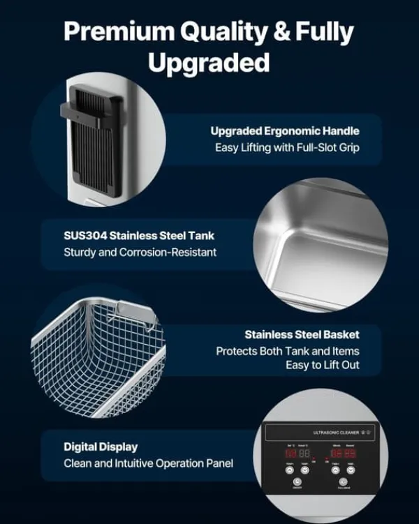 Precision och kontroll En tydlig digital display och timer 0–30 minuter gör det enkelt att ställa in exakt rengöringstid. Få konsekventa resultat oavsett om du rengör känsliga instrument eller robusta metalldelar.