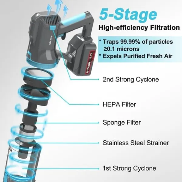 HEPA-filtrering & LED-belysning: Det avancerade HEPA-filtret fångar fina partiklar och allergener, medan LED-borsten lyser upp mörka hörn för mer noggrann rengöring.