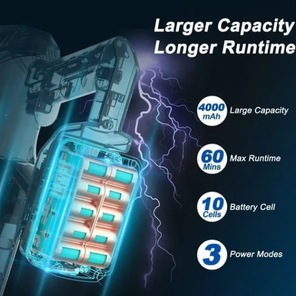 Lång batteritid: Med ett 4000 mAh litiumbatteri kan dammsugaren användas upp till 60 minuter i standardläge, vilket gör den idealisk för längre städpass utan avbrott.