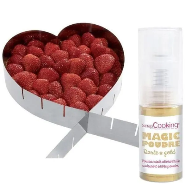 Lite kärlek i dina desserter? Denna hjärtformade bakform med justerbar storlek är din bästa allierade på alla hjärtans dag. Mått: 12 till 26 cm. Höjd 5 cm. Rostfritt stål. Tål diskmaskin, kyl, mikrovågsugn och ugn. Sprayflaskan med ätbar gyllene pulver gör det möjligt att täcka dina tårtor med glitter och ge en iriserande effekt på ditt bakverk. Ingredienser: Antiklumpmedel E555, färgämnen: E172. Spray på 7 g.