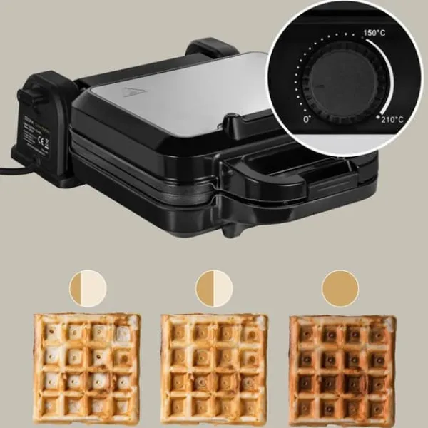 Upptäck Gofree Chef Pro-våffeljärnet med sin roterande mobila bas på 180°, som garanterar krispiga och fluffiga våfflor. Dess non-stick beläggning och låsmekanism för vertikal förvaring gör det till en praktisk och effektiv apparat, perfekt för jämn tillagning.