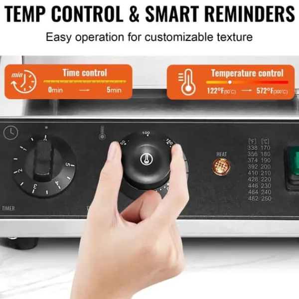 Denna våffelbakningsmaskin har en temperaturkontrollratt (122-572°F / 50-300°C) som låter dig justera temperaturen efter dina preferenser. Anpassa den för att skapa personliga våfflor, antingen krispiga eller fluffiga. Med individuell förberedelse och ljudsignaler är den enkel att använda och påminner dig när det är dags att lägga till smet och när våfflorna är färdiga.