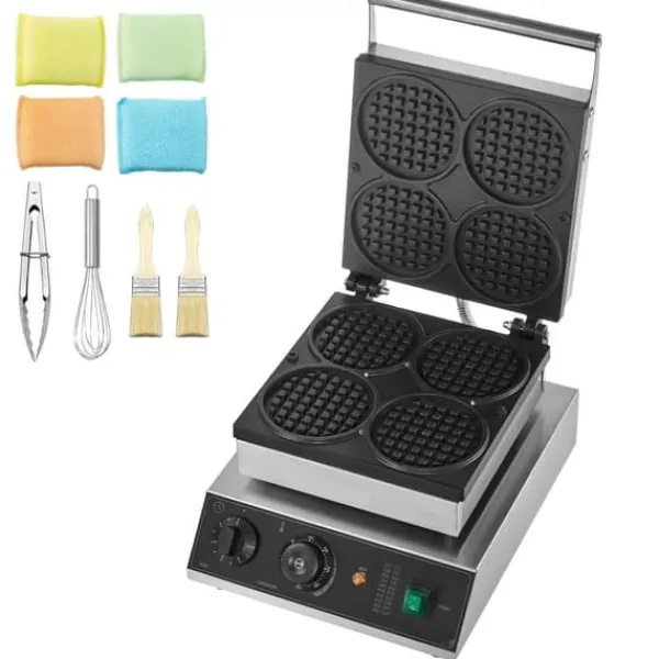 Spiraldesignen och handtag i rostfritt stål bidrar till att förebygga olyckor som halka, överhettning och brännskador. Fyra gummifötter på basen förbättrar stabiliteten och håller våffeljärnet stadigt under användning. Gångjärnet stödjer flexibel stängning och öppning, och maskinen kommer med olika tillbehör för enkel bakning.