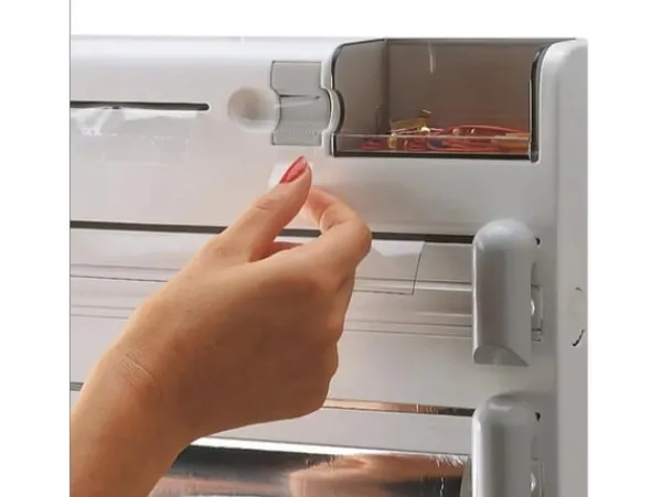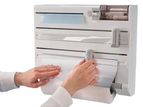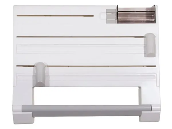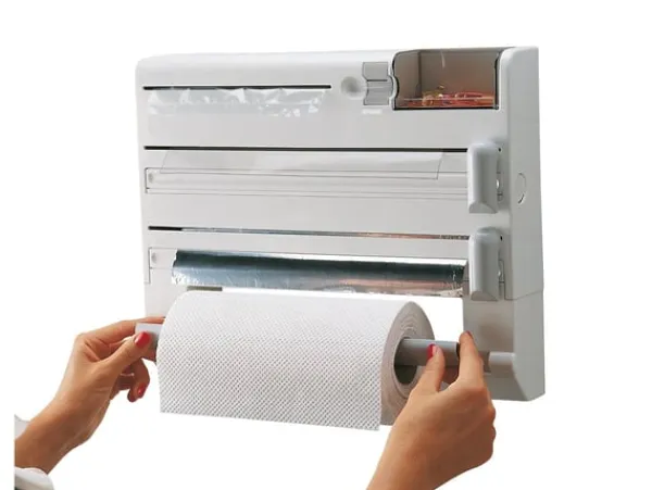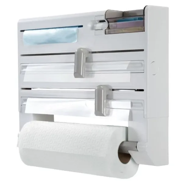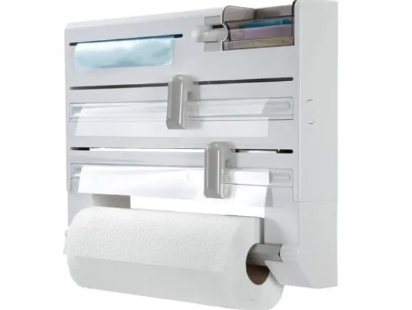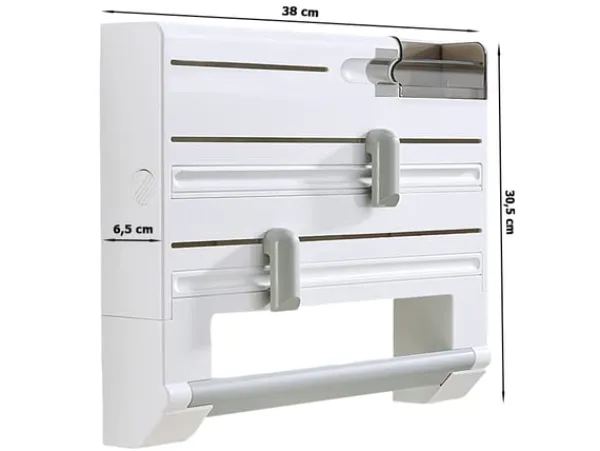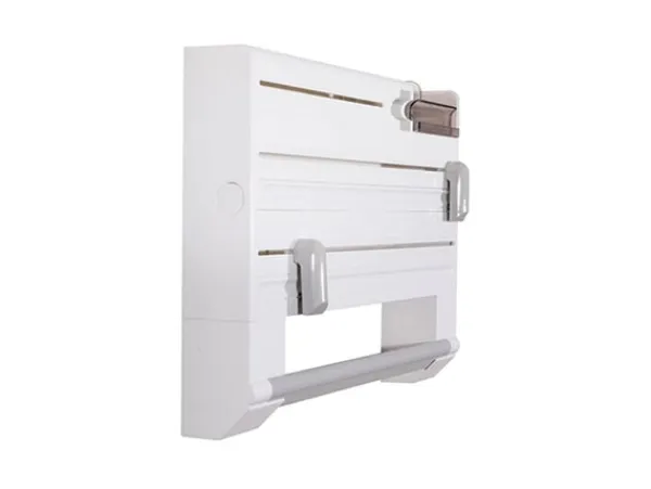 Denna smarta väggmonterade kökshållare är en praktisk lösning för att organisera och effektivisera köksarbetet. Med plats för plastfilm, aluminiumfolie, hushållspapper, fryspåsar och tejp får du allt du behöver inom räckhåll. De dolda bladen och skyddade facken ger trygg användning samtidigt som det är lätt att byta rullar.