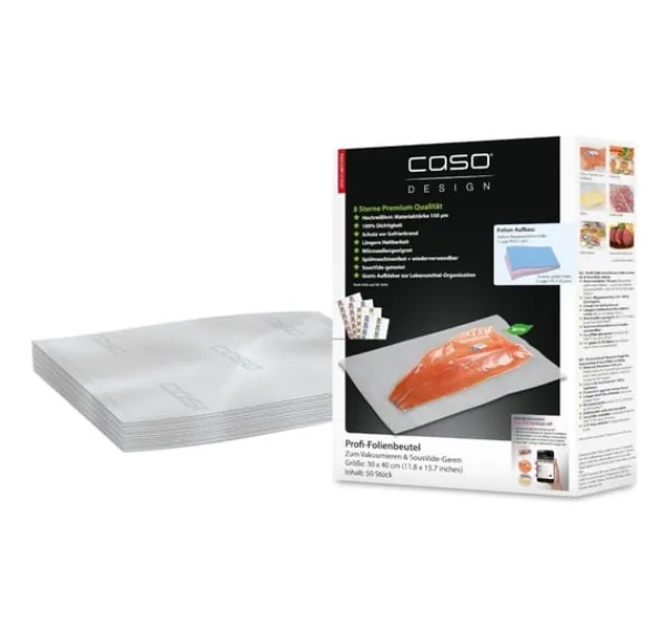 Övriga egenskaper: Stark & Rivbeständig, Mikrovågsanvändning möjlig, Skyddar mot frysbränna och aromförlust, Idealisk för Sous Vide, Tillagad i vatten vid 100 ° C i max 8 timmar, Testad endast med Caso-förseglare