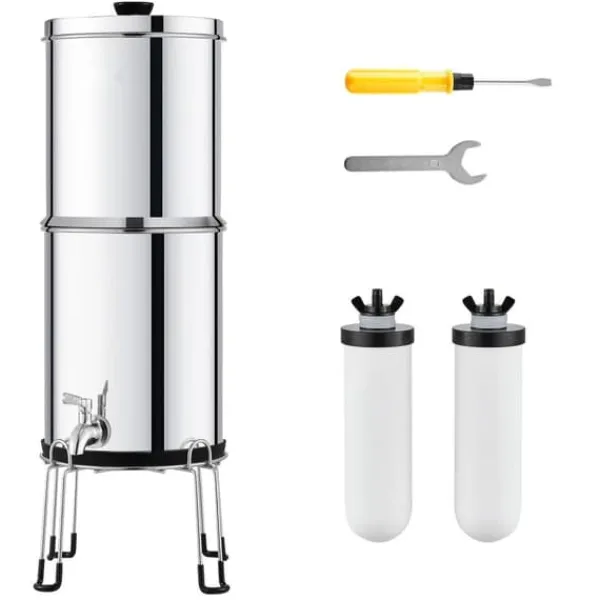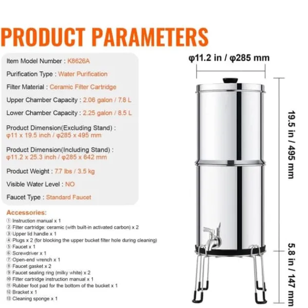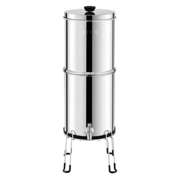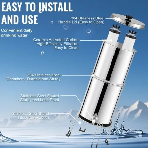 Detta gravitationsmatade vattenfiltersystem använder aktivt kol + keramiskt filtermembran som filtermedium för att ta bort 99% av kloret från vattnet och förbättra dess smak. Det minskar även närvaron av tungmetaller, sediment, rost, jord och andra föroreningar, vilket säkerställer rent och hälsosamt vatten.
