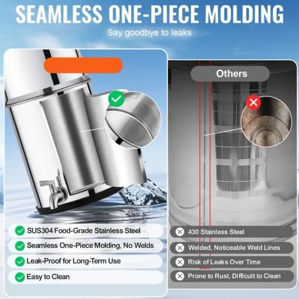 - Hållbarhet och styrka: Den sömlösa cylindern är tillverkad av SUS304 livsmedelsklassat rostfritt stål och är robust och hållbar. Det finns inga svetsar eller läckage i vattenfiltreringssystemet, vilket betydligt minskar risken för vattenläckage.