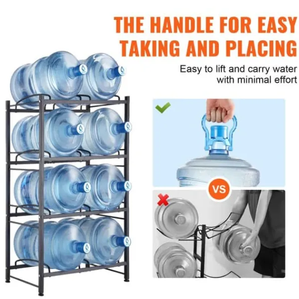 Vattengallonhållaren har höga skyddsräcken för att förhindra att högre hinkar faller, hyllspår för att hålla flaskorna säkra och justerbara fötter för att skydda golv och stabilisera ställningen på ojämna ytor. Handtag gör det enkelt att placera flaskor.
