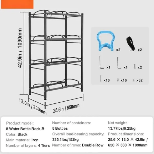 Denna vattenkannahållare är 25,6 x 13 x 42,9 tum och rymmer upp till 8 flaskor, stöder upp till 335,1 lbs. Den passar både 3-gallons och 5-gallons flaskor och håller dem organiserade i ett kompakt utrymme. Dess industriella design matchar olika interiörer, vilket gör den perfekt för alla rum.