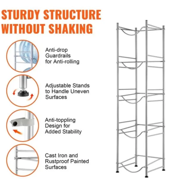 Vår vattenkannahållare har höga skyddsräcken för att förhindra att högre hinkar faller och hyllspår för att hålla flaskorna säkert på plats. De fyra justerbara fötterna skyddar golv från repor och säkerställer stabilitet på ojämna ytor. En tippskyddsfunktion gör att ställningen kan monteras på väggen för extra stabilitet. Handtag gör det enklare och bekvämare att lyfta och placera flaskor.