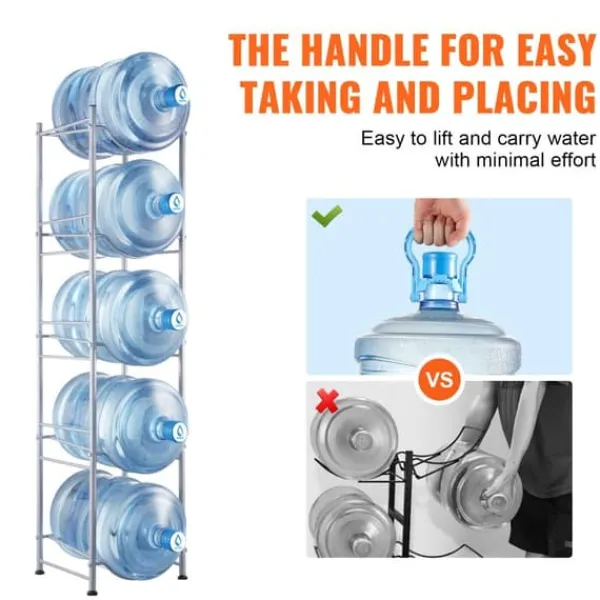 Denna 5-lagers vattenkannahållare mäter 13 x 13 x 53,3 tum. Dess vertikala design rymmer upp till 5 flaskor och stöder upp till 209,4 lbs. Det sparar utrymme genom att stapla flaskor snyggt i ett hörn. Dess enkla industriella design kompletterar olika inredningsstilar, vilket gör den idealisk för alla utrymmen!