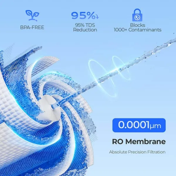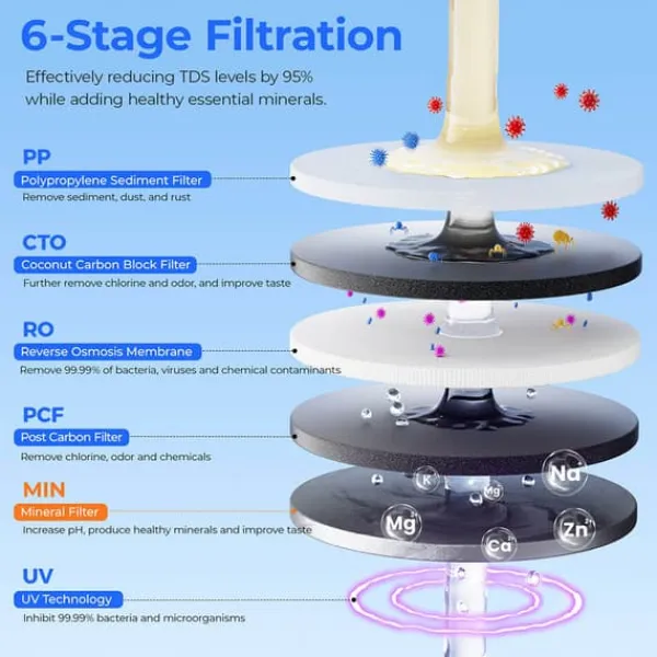Förvandla vanligt kranvatten till exceptionell renhet med vårt avancerade 6-stegssystem (PP-CTO-PCF-MIN-RO-UV) med ett RO-membran på 0,0001 μm med hög precision. Denna anmärkningsvärda teknik eliminerar upp till 95 % av TDS och mer än 1 000 skadliga föroreningar, inklusive tungmetaller, fluorid, klor och skadliga bakterier. Till skillnad från traditionella luftrenare som lämnar vattnet vid sin finhet, fyller vår avancerade remineraliseringsteknik aktivt på viktiga mineraler och harmoniserar pH-nivåerna – vilket ger uppfriskande rent, mineralrikt vatten som stöder optimalt välbefinnande med varje klunk.