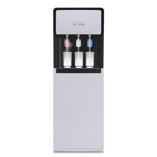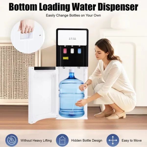 Kombinerad varm-, kall- och rumstempererad vattendispenser – smidig, säker och stilren Denna fristående dispenser i vitt levererar kylt, hett och rumstempererat vatten vid behov. Bottom-loading-designen gör flaskbytet enkelt, medan 500 W uppvärmning och 75 W kylning ger snabb servering – perfekt för hem, kontor och mottagningar.