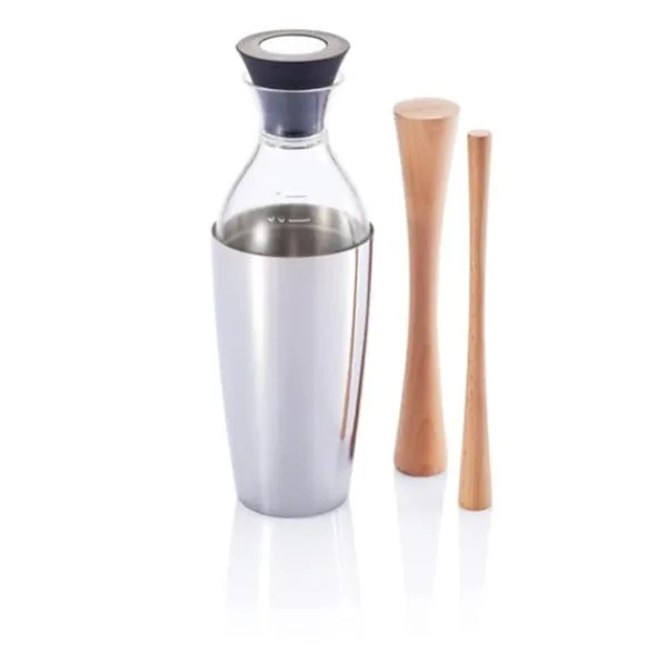 En snyggt designad shaker med lock som även har måttangivelse. Du får också en rejäl muddler och pinne för att röra om.