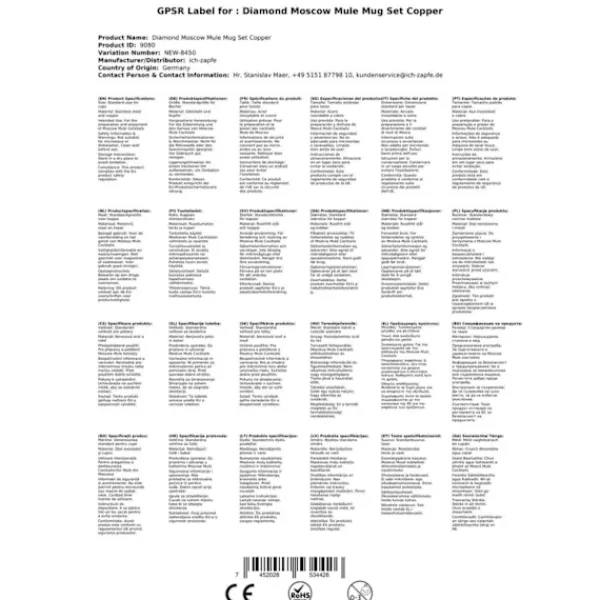 Diamondmoscow mule glas mugg set koppar I en dekorativ presentförpackning! Detta set tillverkat av högkvalitativt rostfritt stål innehåller: •4x Moscow Mule-koppar släta (450 ml)•1x Mini Moscow Mule Jigger amp; Shot (med invändig skalning)•4x kopparfärgade sugrör•1x rengöringsborste för sugrör Rengör innan användningUppmärksamhet! Ej lämplig att använda i diskmaskin