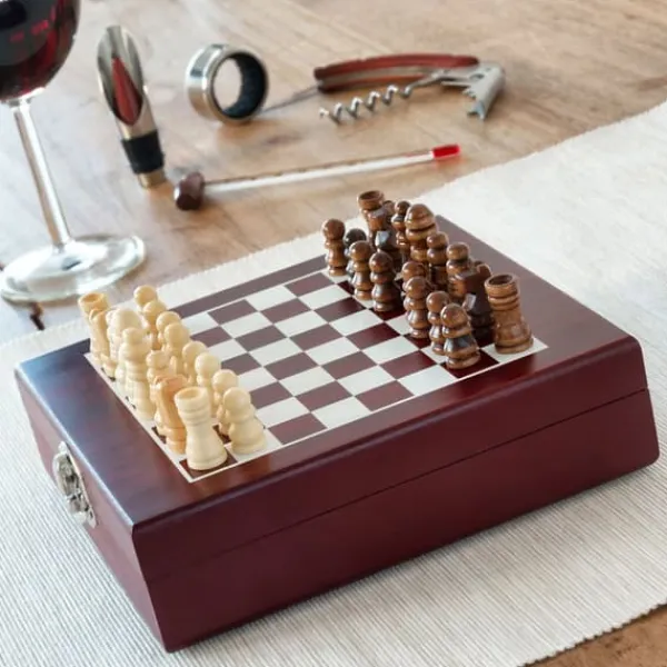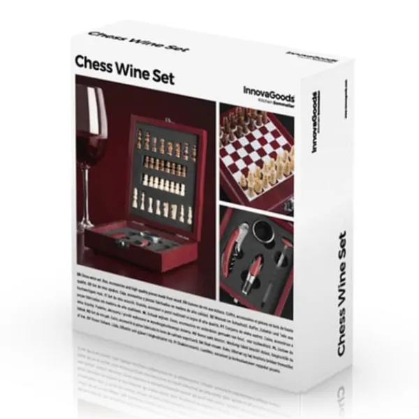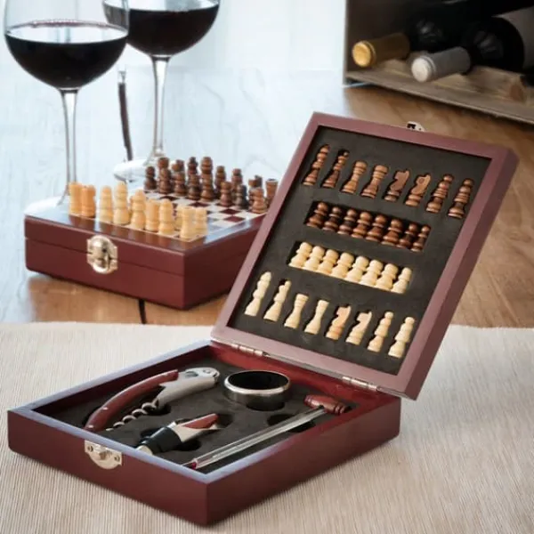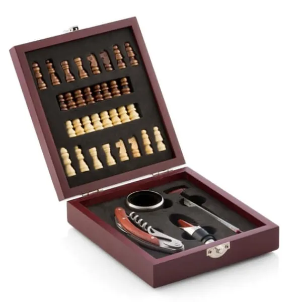 Dess originella och funktionella design gör detta set till en utmärkt gåva. Perfekt och mycket praktisk för fester och tillställningar förenar detta set en komplett upsättning av vinaccessoarer och schack.