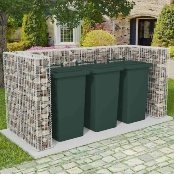 Denna gabionkorg som fungerar som ett skydd för tre soptunnor är perfekt för att gömma undan en soptunna i trädgården, samtidigt som den fungerar som en vacker trädgårdsdetalj.