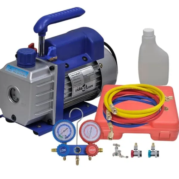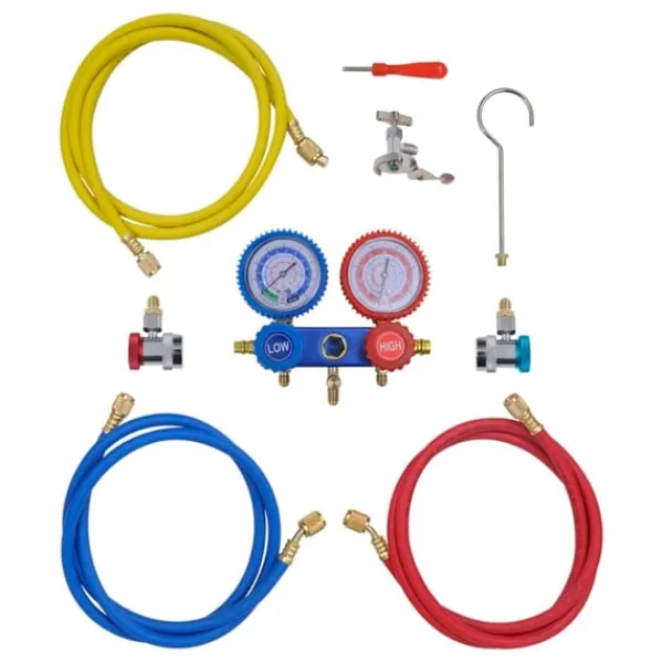 Detta kompletta kylmedelsverktygssats inkluderar vakuumpumpen och en 2-vägs grenrörsmätare i en formblåst väska.