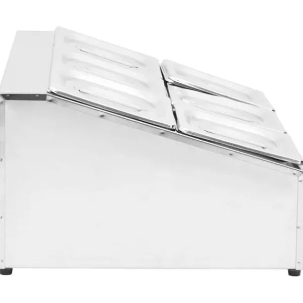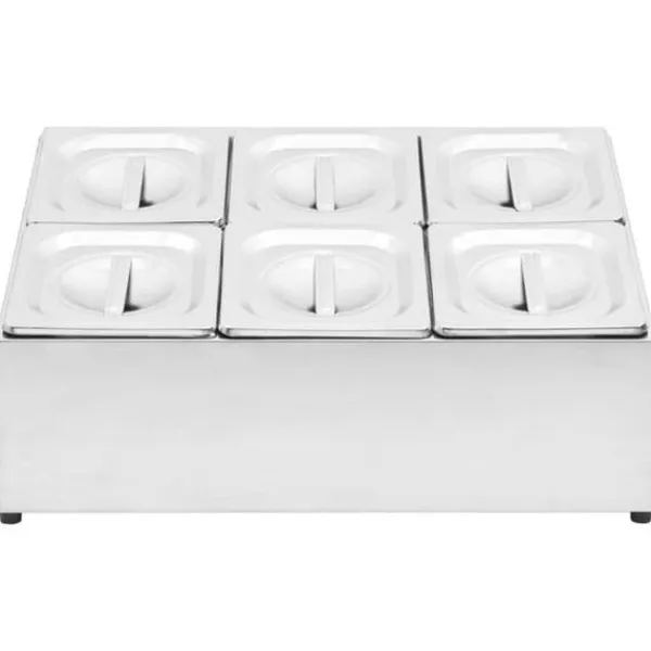 Denna gastronormbehållare i rostfritt stål är perfekt för att förvara och servera dina rätter. Med 6 GN 1/6-kärl och inkluderade lock är den idealisk för restauranger och hushåll. Lätt att rengöra och diskmaskinssäker, garanterar den optimal stabilitet tack vare sina halkfria fötter.