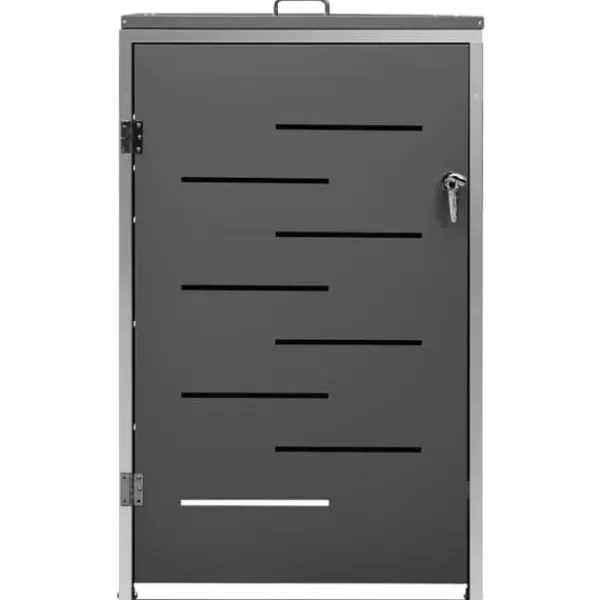 Sopskjulet är tillverkat av galvaniserade stålpaneler och en ram av rostfritt stål, vilket gör det mycket robust och rostbeständigt. Den ihåliga designen släpper in luft och förhindrar otrevliga lukter, medan låset säkerställer säker förvaring av soporna. Dessutom gör det praktiska locket och fjädrarna det enkelt att ta ut och sätta in sopkärlet.
