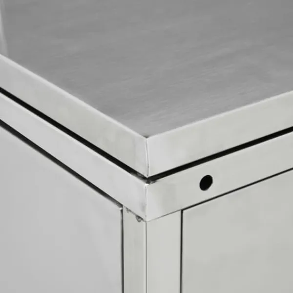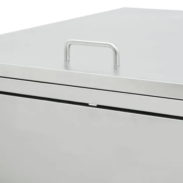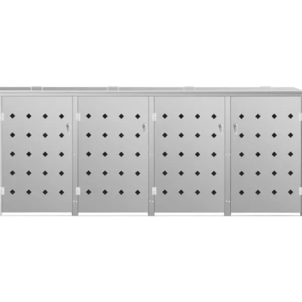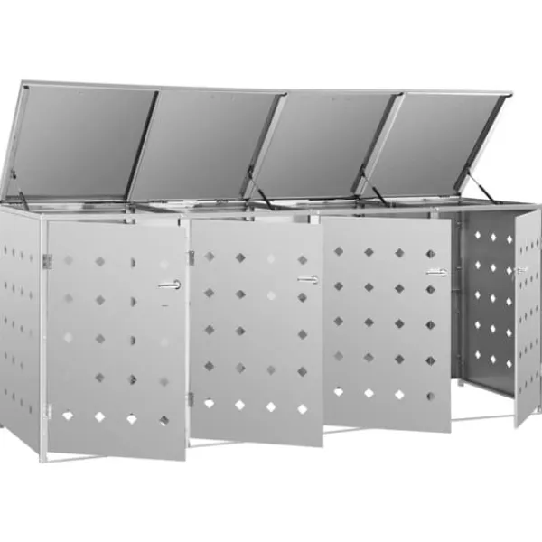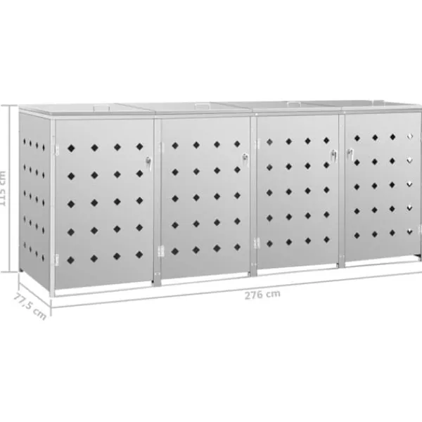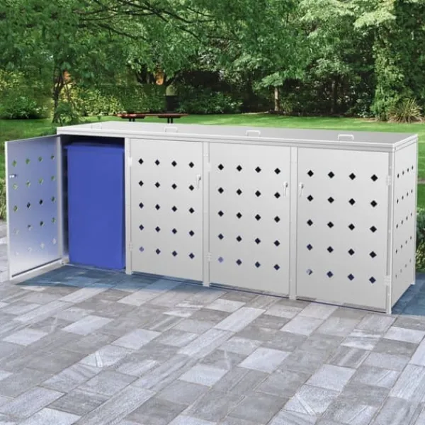 Skjulet för sopkärl är tillverkat av rostfritt stål och är ytterst väderbeständigt och hållbart. De praktiska ventilationshålen möjliggör luftcirkulation och förhindrar otrevliga lukter i skjulet, medan låssystemet gör att soporna förvaras säkert. Dessutom låter den praktiska dörren dig att enkelt sätta in och ta ut sopkärlet.