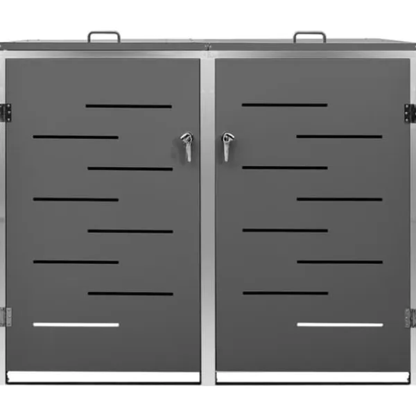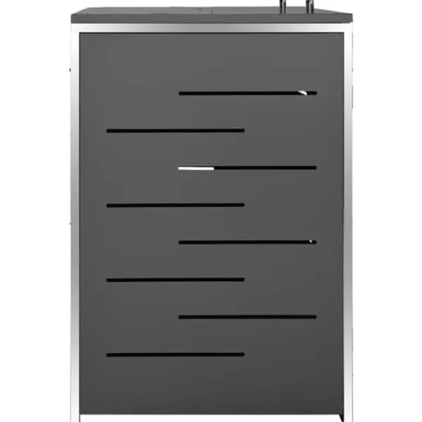 Sopskjulet är tillverkat av galvaniserade stålpaneler och en ram av rostfritt stål, vilket gör det mycket robust och rostbeständigt. Den ihåliga designen släpper in luft och förhindrar otrevliga lukter, medan låset säkerställer säker förvaring av soporna. Dessutom gör det praktiska locket och fjädrarna det enkelt att ta ut och sätta in sopkärlet.