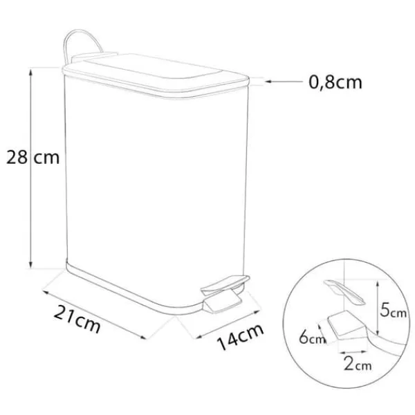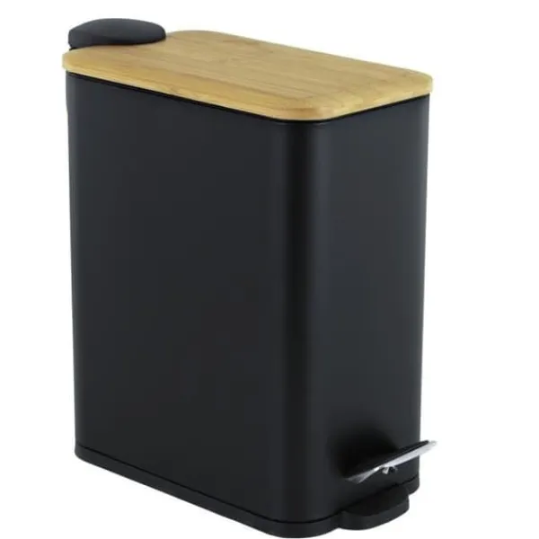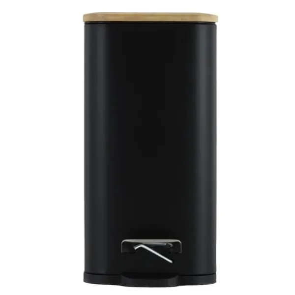 Denna papperskorg kombinerar modern design med miljövänliga material, tillverkad av pulverbelagt stål och naturligt bambuträ. Den svarta pedalpapperskorgen har en elegant matt finish, med ett lock i bambuträ som ger ett unikt, naturligt utseende. Det praktiska pedalsystemet möjliggör öppning av locket utan att använda händerna, vilket är hygieniskt och praktiskt. Den inre hinken, utrustad med ett handtag, gör tömning enkel. Den plastbasen säkerställer att ditt golv skyddas från repor. På baksidan finns ett ytterligare metallhandtag för enkel bärning eller upphängning. Med en kapacitet på 5 liter är denna papperskorg perfekt för badrum som prioriterar stil och hållbarhet.