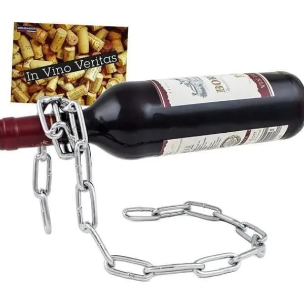 Dekorativ vinflaskhållare BRUBAKER – Presentidé med gratulationskort Vinflaskan är en mycket vanlig present. Har du någonsin tänkt på att göra den lite mer unik genom att ge den tillsammans med en fantastisk magisk vinflaskhållare? Optisk illusion – flaskan verkar sväva horisontellt, hålls endast av kedjan i metall. Denna vinflaskhållare presenterar den värdefulla flaskan på ett extraordinärt sätt.