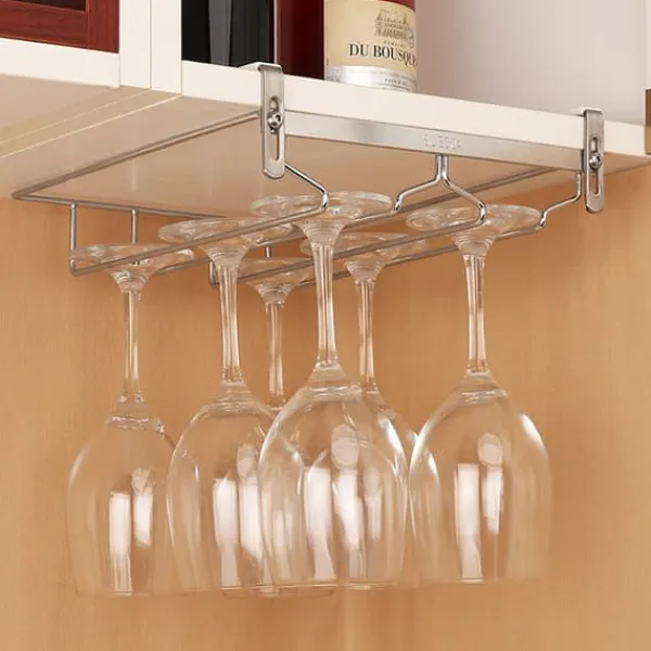 Genom att hänga upp glasen under en hylla frigörs bänkyta och skåputrymme. Dessutom ger den rostfria designen en stilren och modern look.