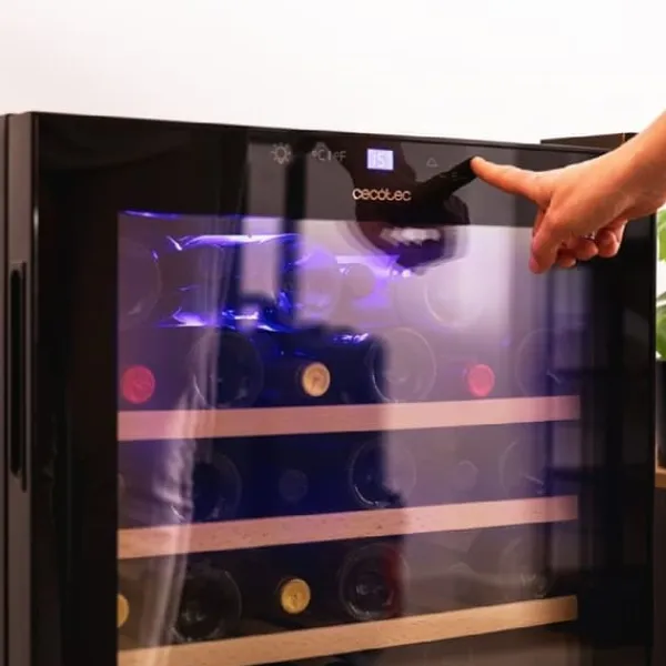 Vinoteket Bolero GrandSommelier 4850 från Cecotec är en fristående enhet designad för att bevara och lagra vin med höga krav på temperatur och utrymme. Med en total kapacitet på 125 liter som rymmer upp till 49 flaskor, kombinerar detta vinotek funktionalitet och bekvämlighet för användare som behöver ett rymligt och organiserat förvaringsutrymme. Utrustad med ett kompressorkylningssystem garanterar det effektiv och konstant kylning, med möjlighet att justera temperaturen mellan 4 och 18 grader Celsius beroende på vintyp, från röda till vita eller roséviner, anpassat efter druvsort och årgång. Dess design har en svart finish, och tillsammans med den enda dörren och det inre LED-belysta utrymmet underlättas visning och åtkomst till flaskorna utan att påverka den termiska stabiliteten. Vinoteket har en intuitiv touchpanel med digital display som alltid visar den interna temperaturen, vilket förenklar inställning av parametrar och styrning av inre belysning. Dessutom gör den tysta driften med en ljudnivå på endast 42 dB den lämplig för vardagsrum, matsalar eller andra rum utan störande ljud. Modellen har energiklass G, vanligt för vinotek med kompressor, vilket innebär kontrollerad energiförbrukning i förhållande till kapacitet och prestanda. Tillverkad i Spanien, erbjuder den en praktisk och estetisk lösning för att bevara vin under optimala förhållanden, vilket skyddar aromer och egenskaper fram till konsumtion. Sammanfattningsvis är Bolero GrandSommelier 4850 ett pålitligt och mångsidigt vinotek som möter lagrings- och bevarandebehov för både vinentusiaster och experter.