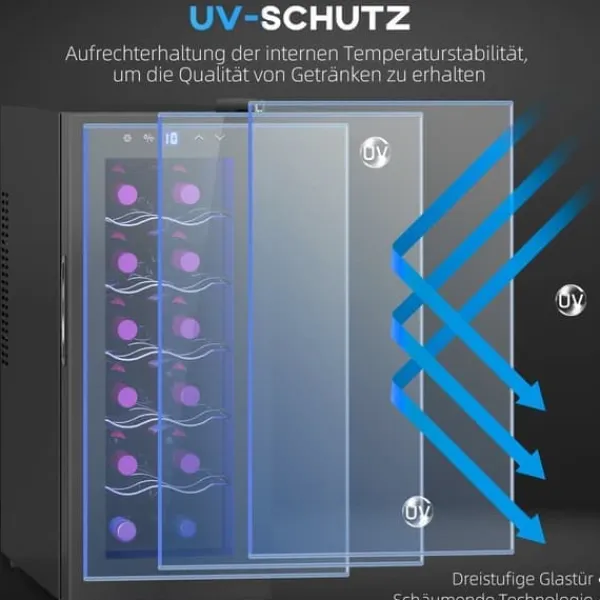 – Förbättrad isolering: Vin kylskåpets trelagers glasdörr med skumteknik och UV-beständighet ger optimal isolering och skydd och bevarar dryckernas kvalitet. Kompletteras med ett mysigt blått takfönster och en dörr med glasfönster för synlig skönhet.
