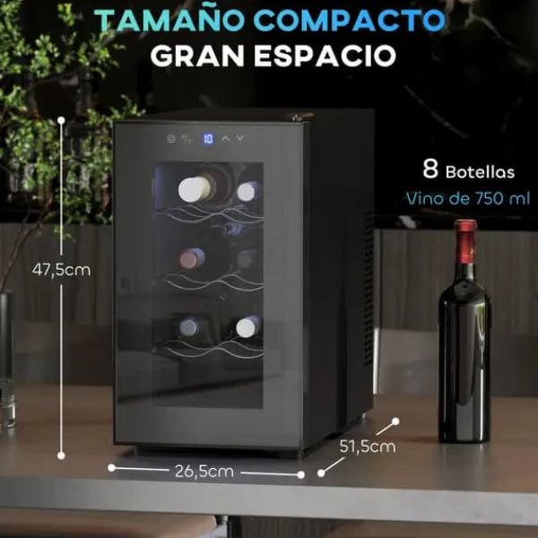 Kompakt vinkyl för 8 flaskor med snabb, tyst termoelektrisk kylning. Den svarta designen, UV-skyddad trippelglasdörr och blå LED-belysning bevarar smak och lyfter din kök- eller hemmabar-miljö.