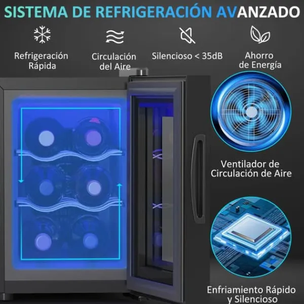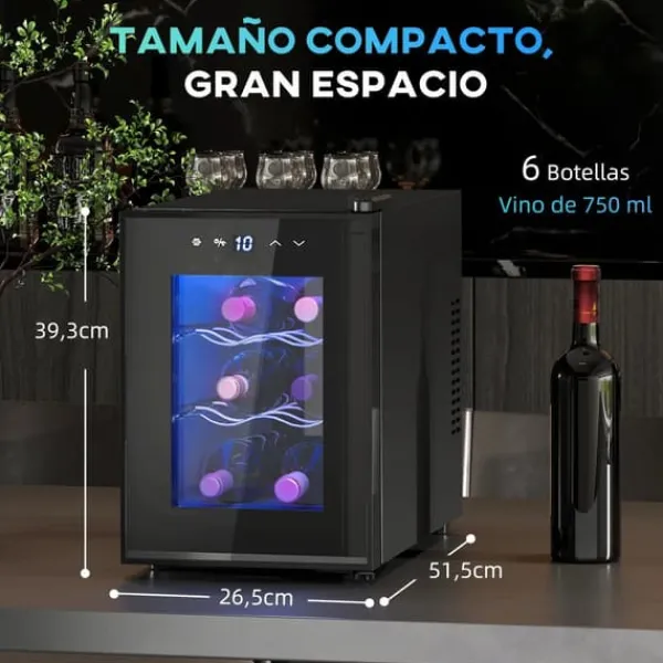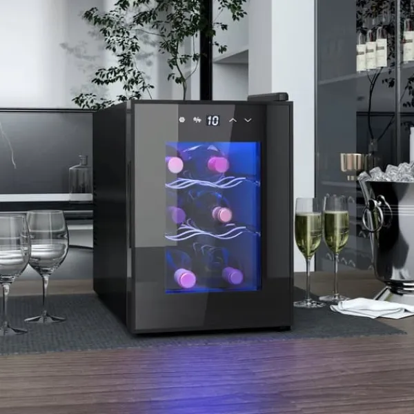 Njut av vin i perfekt skick med ett kompakt vinskåp för 6 flaskor. Det dubbla termoelektriska kylsystemet kyler snabbt, tyst och energieffektivt (klass E), medan den eleganta svarta designen passar kök, lägenheter och hemmabaren.