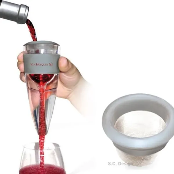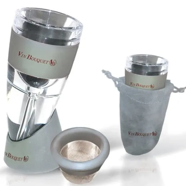 Upptäck VinBouquet vinluftaren, som dekantar ditt vin direkt utan karaff. Förbättra aromerna och smakerna redan vid servering. Praktisk och elegant, levereras den med en broderad sammetspåse, perfekt för vinälskare.