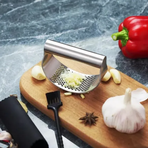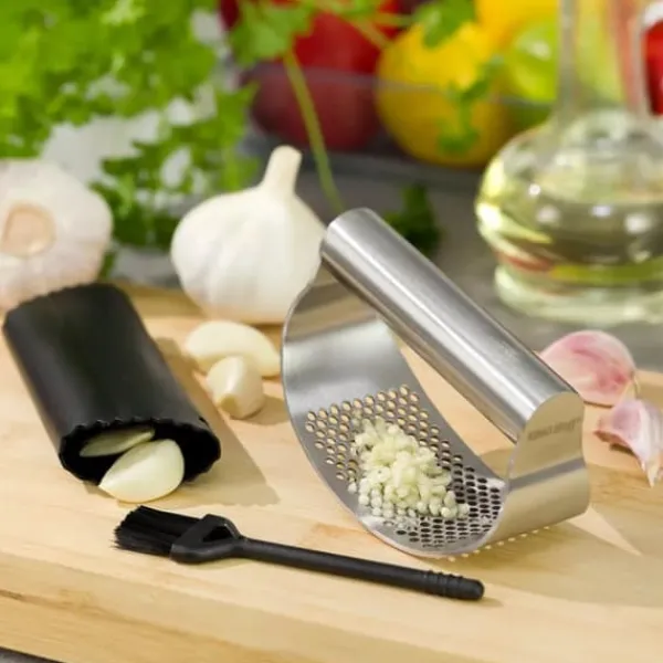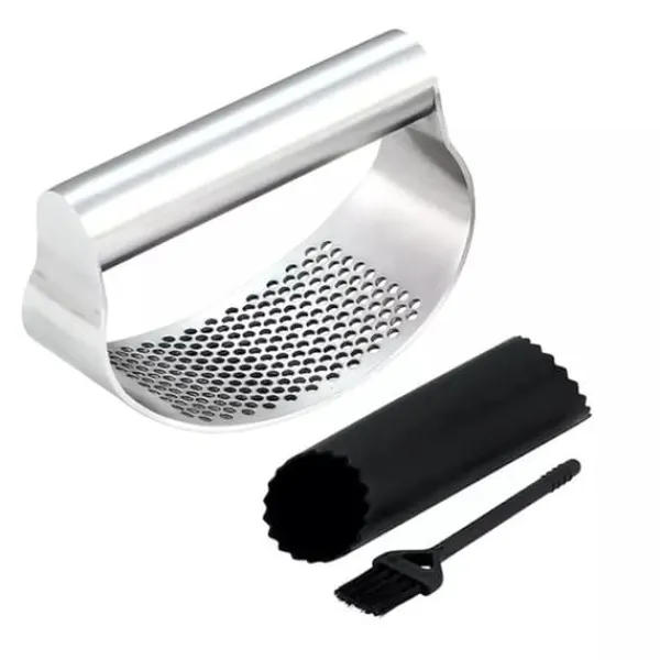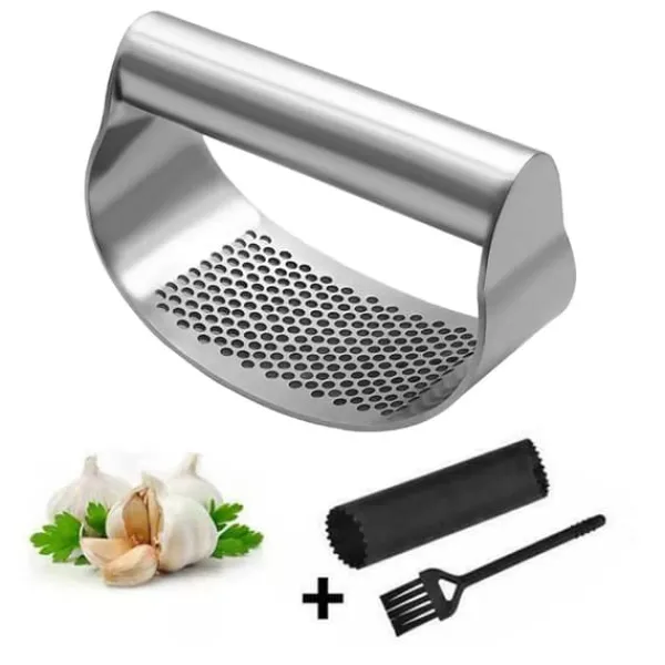 Tredelad vitlökskalning och pressning. Setet innehåller: – silikonhylsa för att skala vitlök – stålpress för att krossa vitlöksklyftor – silikonborste för rengöring av pressen Egenskaper: -Premiummaterial: Hela kroppen på premium vitlökspressen är gjord av rostfritt stål, den är mycket hållbar, den är resistent mot korrosion, rost, utan att lämna någon smak. – Ergonomiskt handtag med bekvämt grepp som är lätt att använda med en hand, även för personer med svaga grepp eller små händer. – Multifunktionell användning: Denna vitlökskvarn kan inte bara hacka vitlök, ingefära, jordnötter och andra små nötter, utan också mosa taro, potatis, ägg och andra livsmedel, och blir en oumbärlig artefakt i köket. – Lätt att använda: Vitlökskrossen har en integrerad strömlinjeformad design, enhetliga presshål, bara gunga fram och tillbaka för att enkelt krossa vitlök. – Efter att ha krossat vitlöken är det lätt att samla ihop den hackade vitlöken med en pensel. – Hygieniskt att underhålla, skölj under rinnande vatten direkt efter användning, låt inte torka ut – tål maskindisk. – Det böjda handtaget är lätt att förvara och bära, och du kan hänga det på väggen för att hålla ditt kök snyggt och spara utrymme