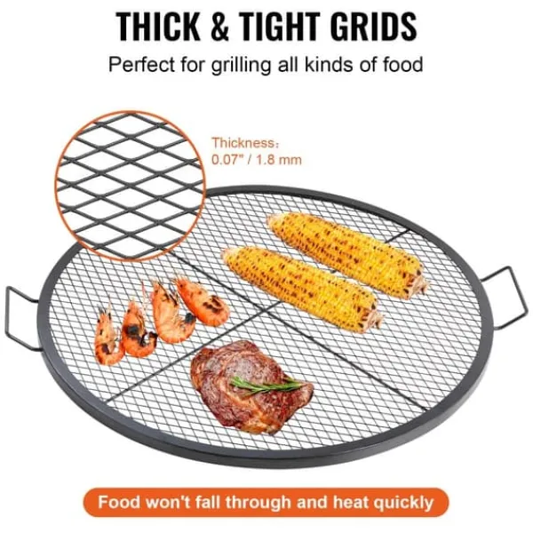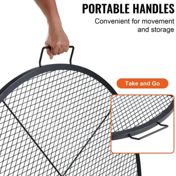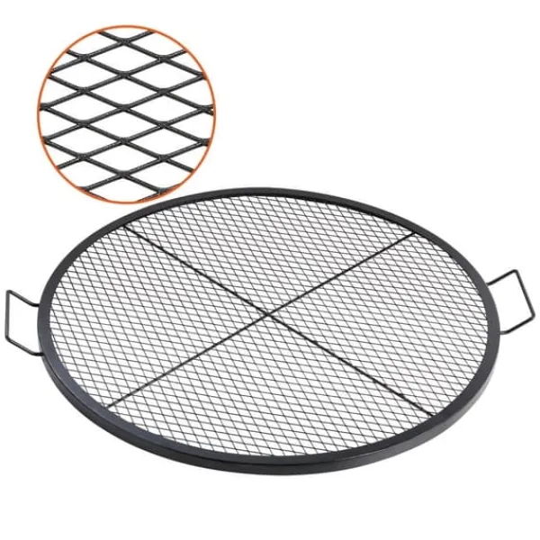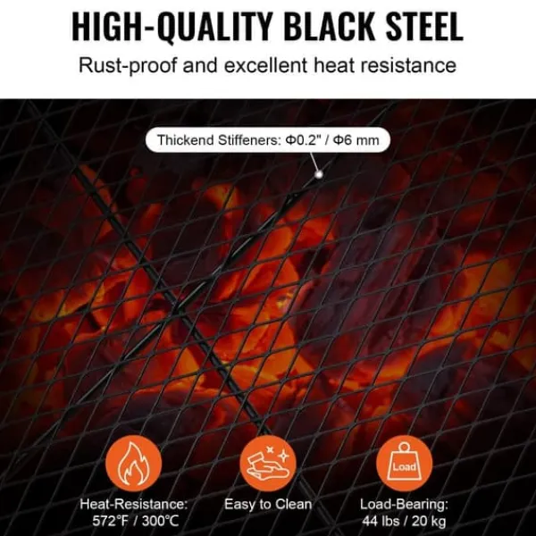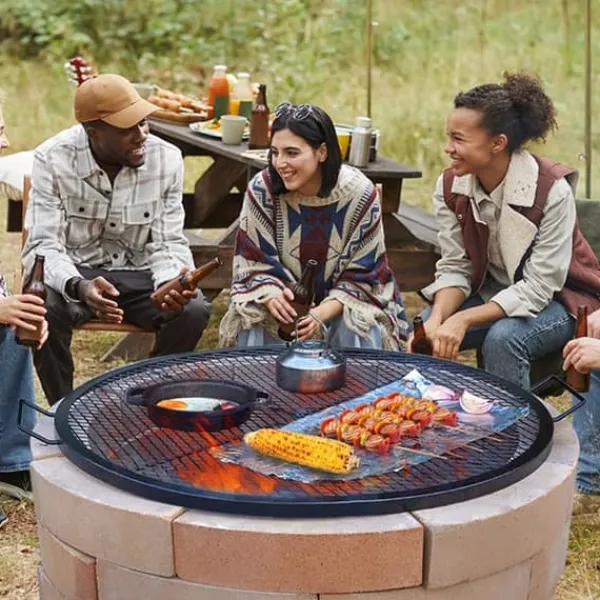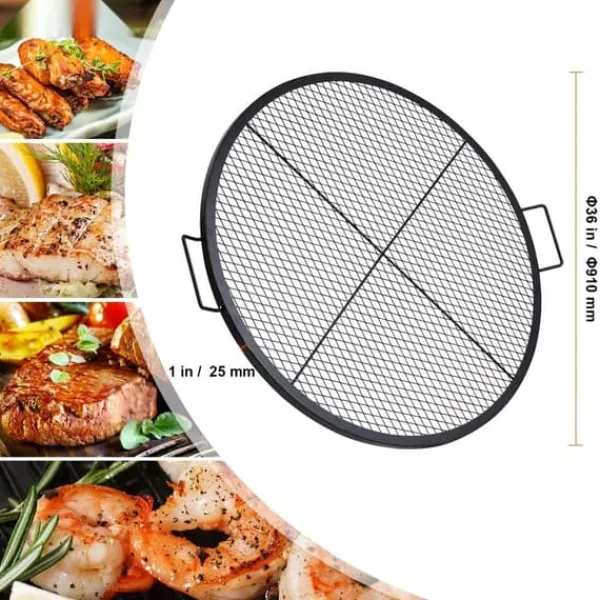 Större grillyta: Den stora grillytan på 36 x 36 tum (910 x 910 mm) gör vår eldstadsgrill till den perfekta grillen för familje- och vänsammanhang. Den rymmer upp till 25 lbs (20 kg) mat för 8 personer. Den kan placeras direkt över elden utan montering och möjliggör perfekt stekning av biffar, fisk, kebab, revbensspjäll, pizza, korv, ostron och olika grönsaker.